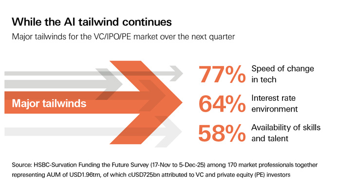 Against this backdrop, investor sentiment about the near-term outlook for VC/PE activity has fallen back a little but remains positive. Some 42% of private market investors foresee an increase in activity over the next quarter, down from 55% in our previous edition (October 2025). Sentiment about the longer-term outlook has also softened a little, with 55% expecting stronger activity over the next 12 months, down from 74% in October. The economic environment and macro risks are seen as the key headwinds to activity, while the pace of technological change remains the key tailwind.