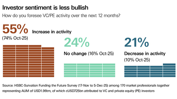 The outlook for venture capital (VC) activity has moderated a little since October on the back of fears over AI investments and fallout from the private credit challenges in the US, but remains positive. Public investors overwhelmingly expect equity markets to continue the rally into the new year.