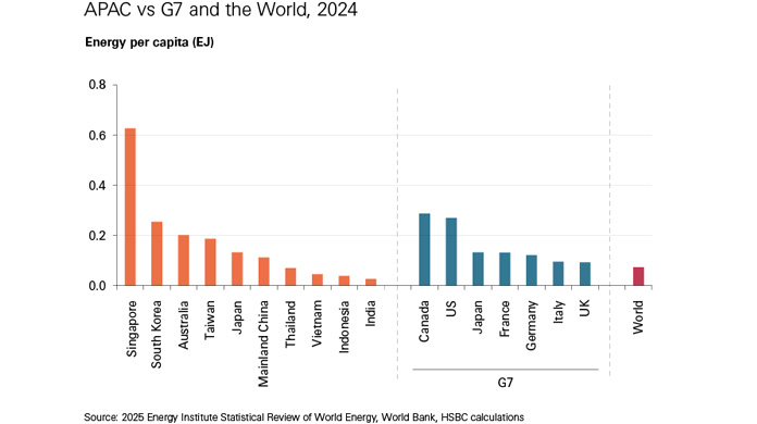 APAC is the world’s leader in renewable power, with 64% of global solar capacity and 54% of global wind capacity as of 2024.3 Despite this, coal continues to be its most important fuel source. More than half of APAC’s electricity is generated by coal, and it is the only region with positive growth in installed coal capacity - around 3% per annum from 2019-20244 . Coal is a significant portion of the electricity mix not only in emerging Asia, but also in developed markets. The relative youth of much of APAC’s coal fleet and the need to replace generating capacity with renewable power could slow advancement of the energy sector’s progress towards net-zero.