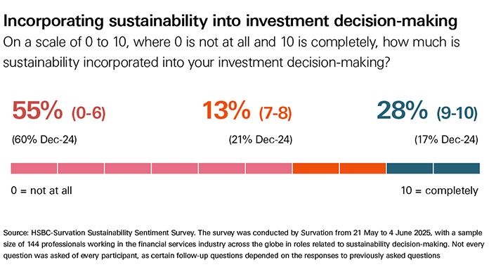 We have renamed the HSBC Sustainability Sentiment Survey (previously the ESG Sentiment Survey) to reflect our updated focus on sustainability research and integration. The sample size varies from survey to survey and, as such, changes are comparable but not ‘like for like’. Also, given that respondents vary by question and by region, we can often garner signals in the data rather than representation or statistical significance.