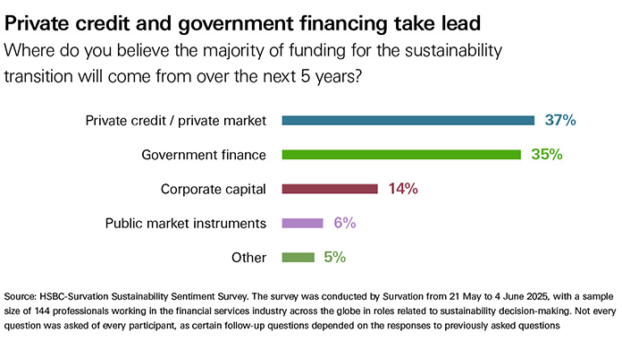 Funding outlook. Looking to the future, investors expect the majority of transition funding to come from private credit and governments. Regions are divided on this, with Europe seeing a bigger role for private credit and North America looking to government and development finance institutions.