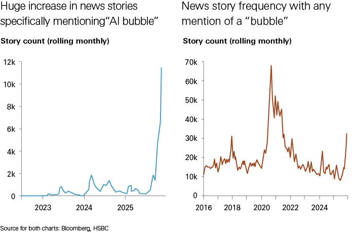 Fears of a trillion-dollar “AI bubble” are growing among investors. Critics claim that artificial intelligence is overhyped, with unclear return on investment (ROI) and limited commercial applications. Mentions of the phrase “AI bubble” in news stories have surged in recent months (Chart 1). This has contributed significantly to any mention of the word “bubble” in the financial media (Chart 2). As a result, some investors are concerned that markets have already stepped into a bubble territory. We disagree.