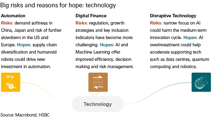 On tech, for all the worries about AI, it could also offer tremendous benefits and usher in an era of unprecedented human discovery, making it much easier to find cures for diseases or solutions to other existential problems within society. The continued spread of digital technology could be a huge boost to underlying productivity, too.