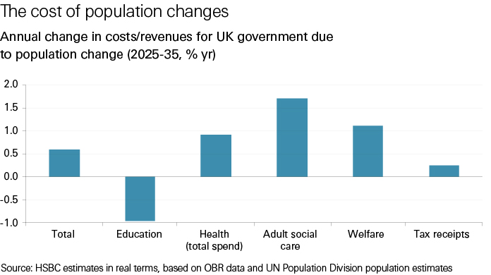But these benefits look set to be relatively small against the scale of spending in areas that technology can’t help with – such as debt service, pensions and social security – meaning that at a push we could see government spending bills drop by 2-3% compared to a baseline from these improvements. Equally challenging is the fact that ageing populations look set to push up the real-terms spending needs of healthcare and social care by 1% per year over the coming decade, and total spending by 6% over 10 years – while revenues may struggle to grow by half of that over the same time with fewer working-age people.