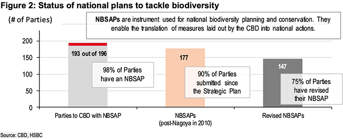 Implementation and reporting: The various principles of CBD, covering areas such as the identification and monitoring of relevant issues, the conservation of various components, are supposed to be implemented at a Party (i.e. national) level through National Biodiversity Strategies and Action Plans (NBSAP). In theory, these are supposed to be reviewed and revised periodically to incorporate the latest CBD decisions as well as be formally legislated into national laws and policies. Currently, 193 Parties have submitted at least one NBSAP (Fig 2). Success has been muted and biodiversity continues to deteriorate both globally and nationally.