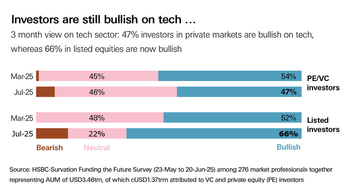 There is a marked contrast between private investors and those investing primarily in publicly listed companies, however. After a volatile April, public markets recovered momentum and seem to have become less responsive to tariff announcements. When it comes to the key tech sector, for instance, more public investors are bullish about the outlook for the next three months (66%) than their private counterparts (47%). What is more, investors in listed equities have grown more bullish on tech compared to our March survey at the same time as turning distinctly less bullish about healthcare, typically seen as a defensive sector.