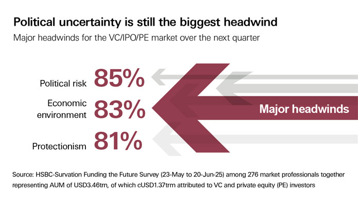 Against this backdrop, investor sentiment about the near-term outlook for VC/PE activity has deteriorated further. Just 30% of private market investors foresee an increase in activity over the next quarters, down from 47% in our previous survey in March 2025. This is the lowest reading since our series of surveys began in April 2024. Some 64% (down from 78%) see activity picking up over the coming year, suggesting confidence about the longer term is also fraying somewhat. Political risk, changes to the economic environment, and protectionism are seen as the top three risks to the outlook for VC/PE activity.