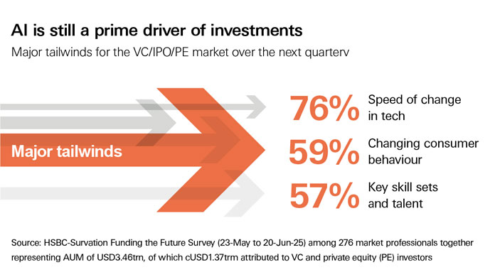 - Key tailwinds: the speed of technological changes and availability of key skills and talent remain key tailwinds for the private markets, according to our survey. A growing proportion (59%) now also see changing consumer behaviour as a tailwind. This is perhaps a byproduct of AI innovation as consumers increasingly adopt the technology.