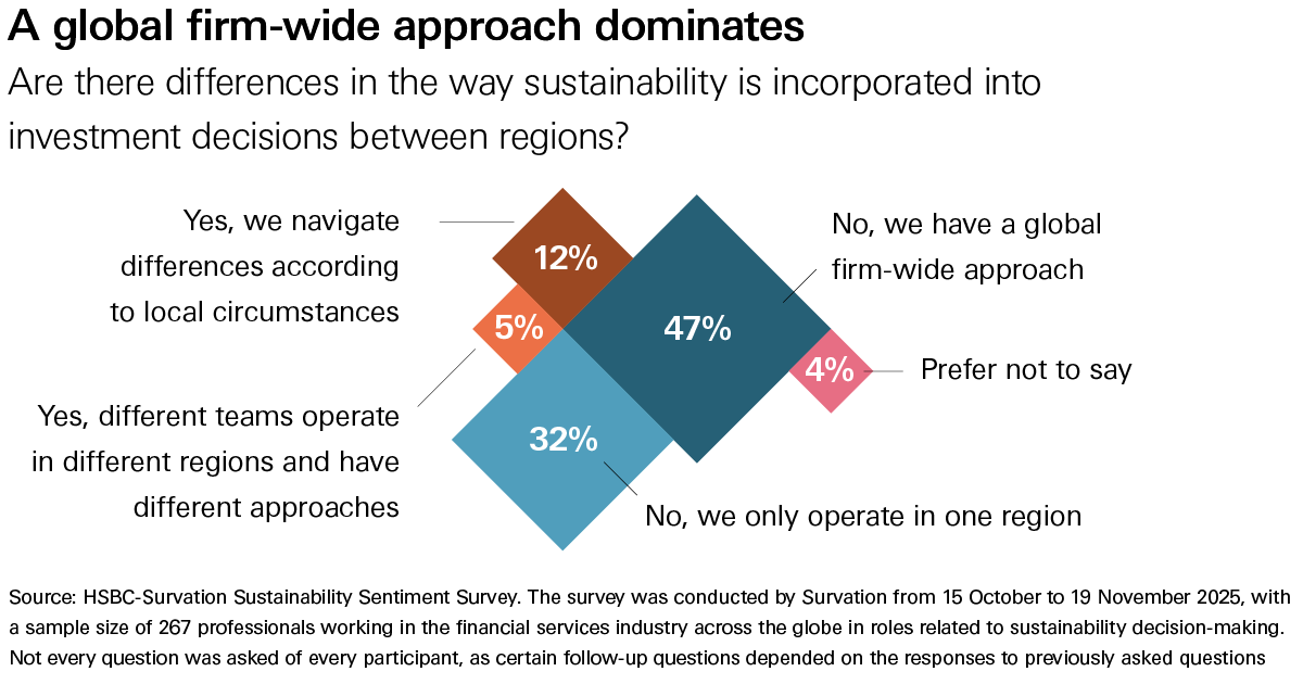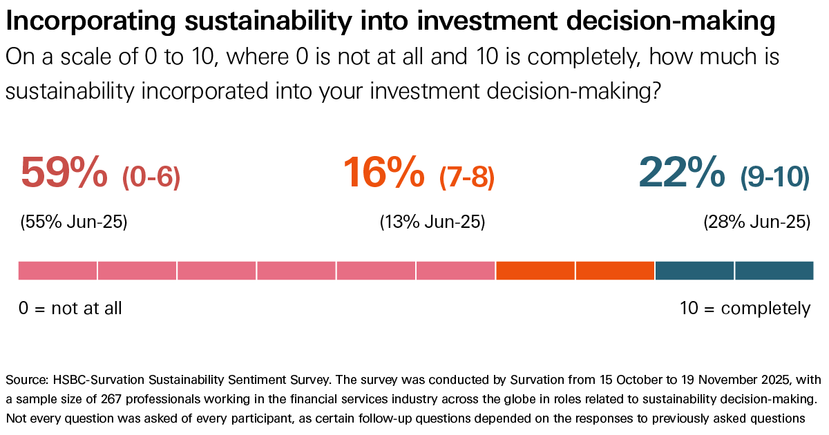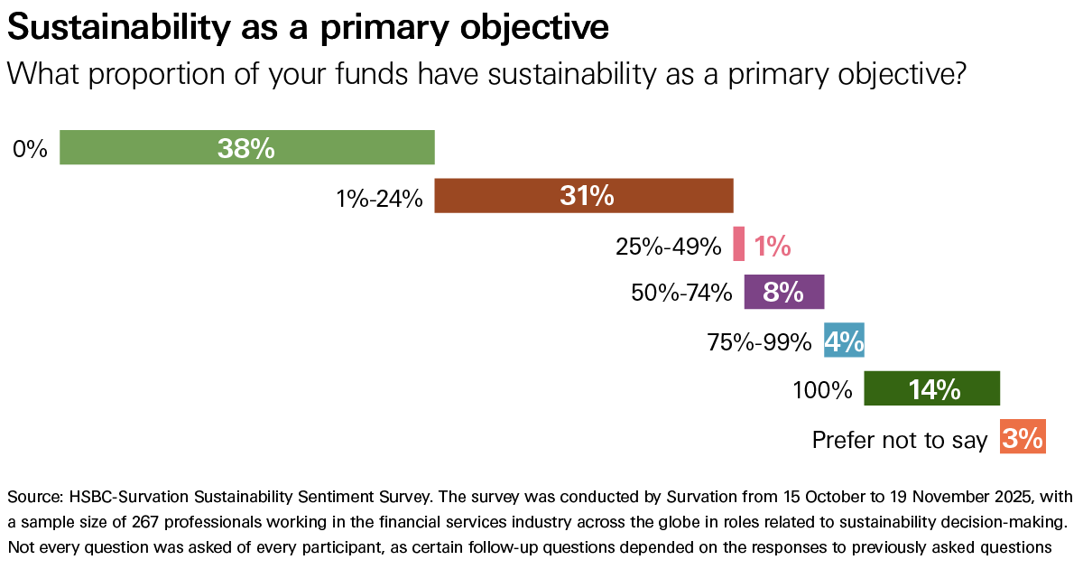 What are investors thinking about sustainability now? Our latest HSBC Sustainability Survey was conducted by Survation from 15 October to 19 November 2025, with a sample size of 267 professionals working in the financial services industry across the globe in roles related to sustainability decision-making. The respondents represent USD5.5trn in AUM across 243 institutions.