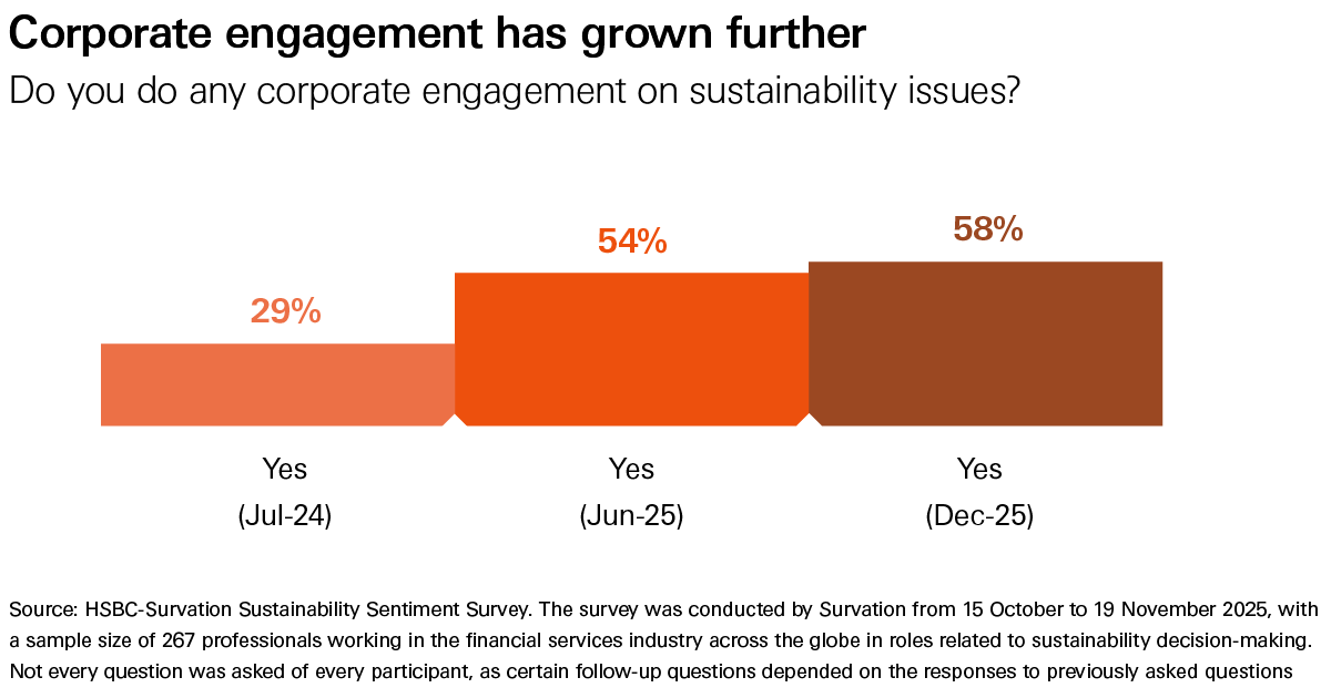 On corporate engagement, results highlight that this has increased at the top end, with more respondents executing engagement activities than previous surveys. As scrutiny over sustainability issues intensifies and regulations develop, engagement is of ever-growing importance, in our view.