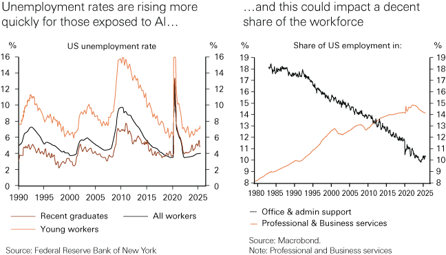 Across the world, professional services firms – where the impact of AI is greatest – are cutting back on graduate hires, as AI tools can replicate the work that many of these new entrants to the labour market would have been doing. Of course, it’s not easy to disentangle the impact of AI on the labour market versus cyclical drivers. After all, the unemployment rate for young people has been rising more quickly than for the population as a whole in the US among both graduates and non-graduates.