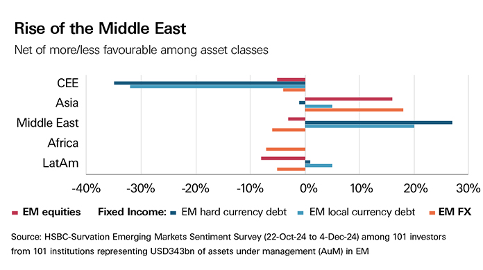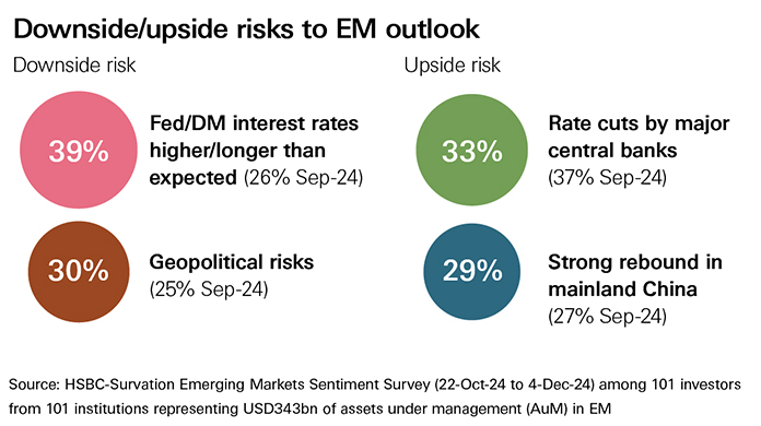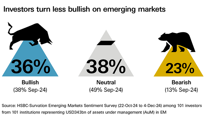 Investors have turned a little more cautious on emerging markets (EM) but continue to see select opportunities as we head into 2025, according to HSBC’s 18th EM Sentiment Survey.