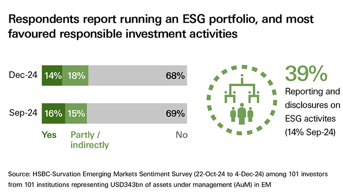 On the Environmental, Social and Governance (ESG) front, the share of investors running an ESG portfolio directly and partly/indirectly was almost unchanged at 32% compared to the previous survey.