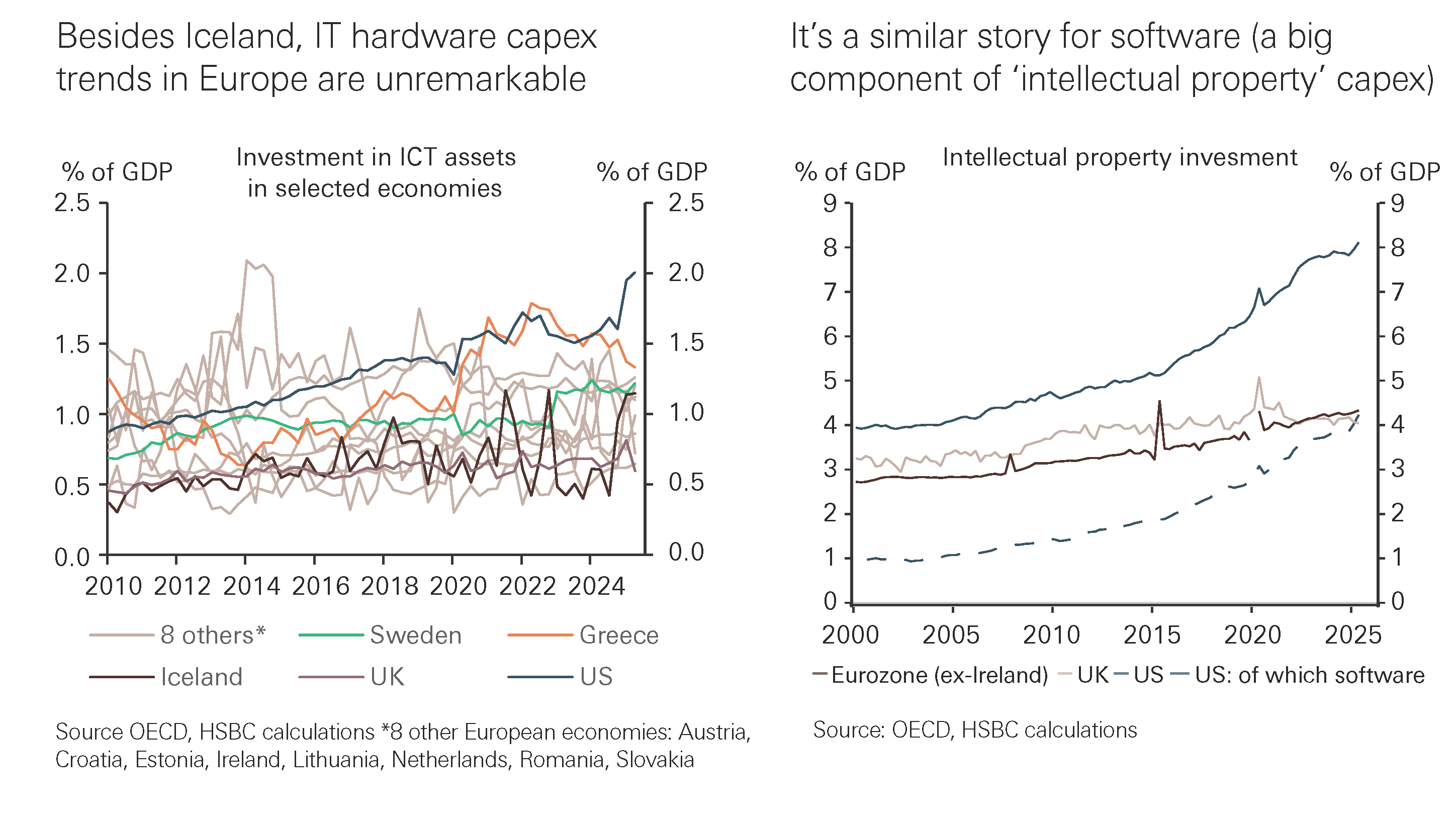 So far, we see limited evidence that Europe is joining the party. Bar a couple of exceptions – an emerging datacentre boom in Iceland, and some Q3 strength in the UK and France – the official data generally show unremarkable developments in IT hardware and software investment in Europe in 2025.