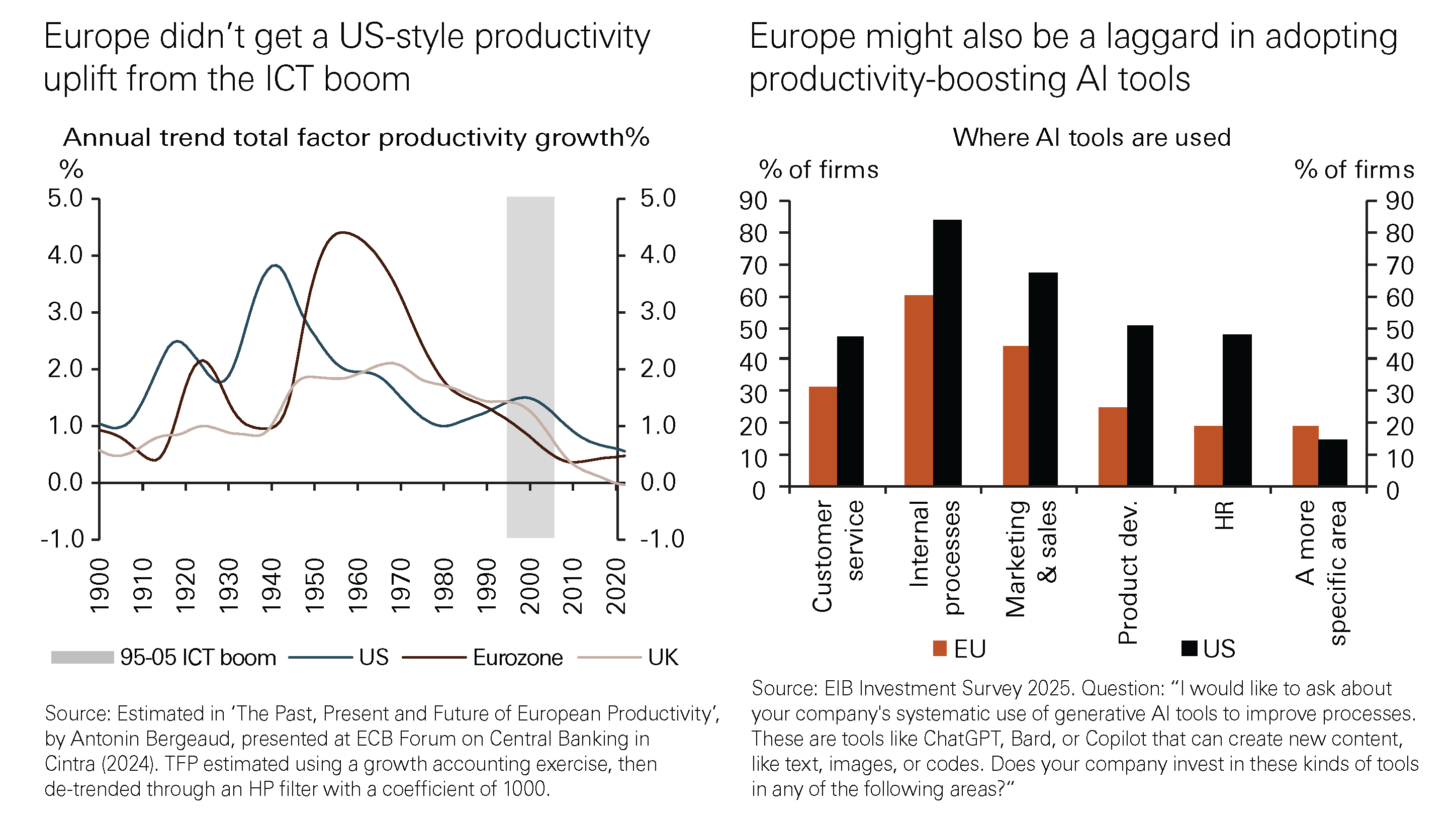 Not necessarily. For example, the ICT boom in the 90s/00s appeared to provide a much smaller uplift to productivity in Europe than in the US. The stage could be set for a repeat performance, with surveys suggesting that European companies have so far made much less progress in embedding AI than their American counterparts.