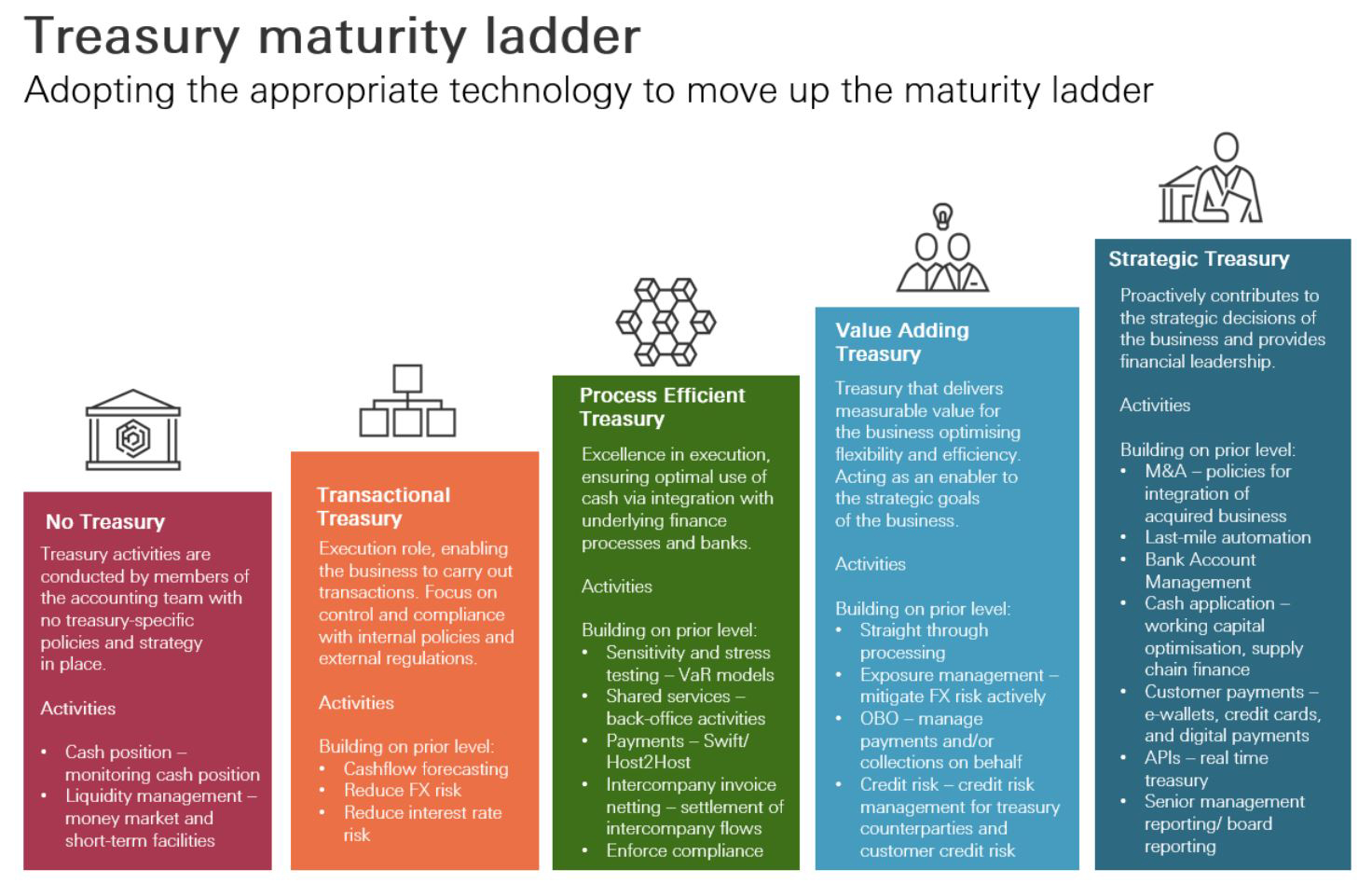 A treasury team’s degree of technological adoption generally correlates to their role within an organisation: from an emerging treasury function within a finance team, to a more mature unit that is proactively contributing to strategic business initiatives.