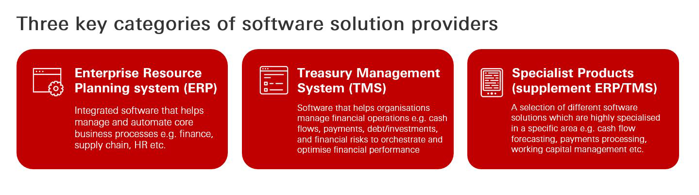 These tasks are generally supported by three types of solutions: Enterprise Resource Planning (ERP), Treasury Management Systems (TMS), or specialist products.