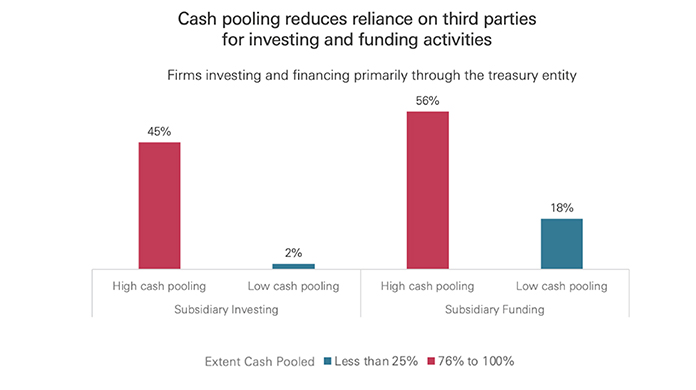 3. Leveraging in-house banks (IHBs) and cash pooling to generate capital efficiencies: Treasuries leveraging IHBs and cash pooling can generate significant capital efficiencies. Firms pooling most of their balances are twenty-two times more likely to have subsidiaries invest through the treasury entity and three times more likely to fund them internally rather than through third parties. This approach strengthens liquidity control, reduces borrowing costs, and increases financial flexibility across the enterprise.