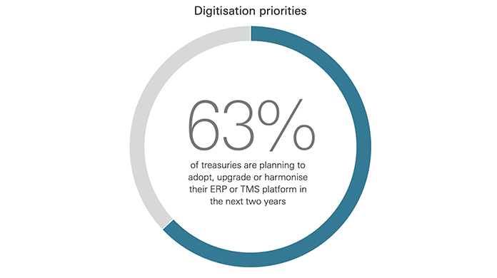 1. Harnessing technology and digitisation to serve the complex needs of the business: Many respondents mention the importance of automation, data, up-to-date technology and analytics in enhancing efficiencies and enabling the treasury to support better decision-making. 63% of treasuries are planning to adopt, upgrade or harmonise their ERP or TMS platform in the next two years.