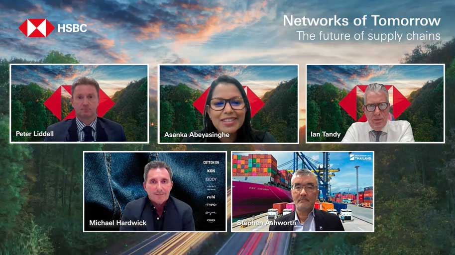 A panel discussion with Michael Hardwick, Chief Financial Officer at Cotton On Group, Stephen Ashworth, Managing Director, Thailand & South East Asia at Hutchison Ports, Peter Liddell, Global Operations Centre of Excellence Lead and Partner, KPMG and Ian Tandy, Managing Director and Co-Head of Global Trade Solutions, Asia-Pacific, HSBC on the shifting supply chain trends and how technology and sustainability should be embedded in building stronger supply chain resilience, moderated by Asanka Abeyasinghe, Head of Global Trade Solutions, HSBC Sri Lanka and Maldives.
