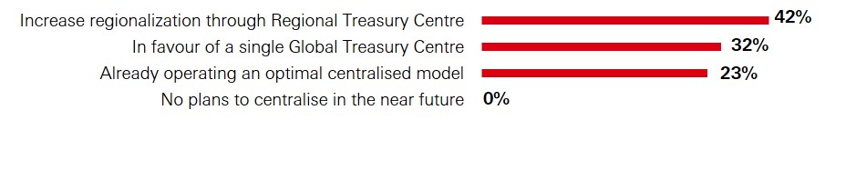 Asked about centralisation, over 40% of treasurers were more enthusiastic about increased regionalisation through Regional Treasury Centres than a single Global Treasury Centre.
