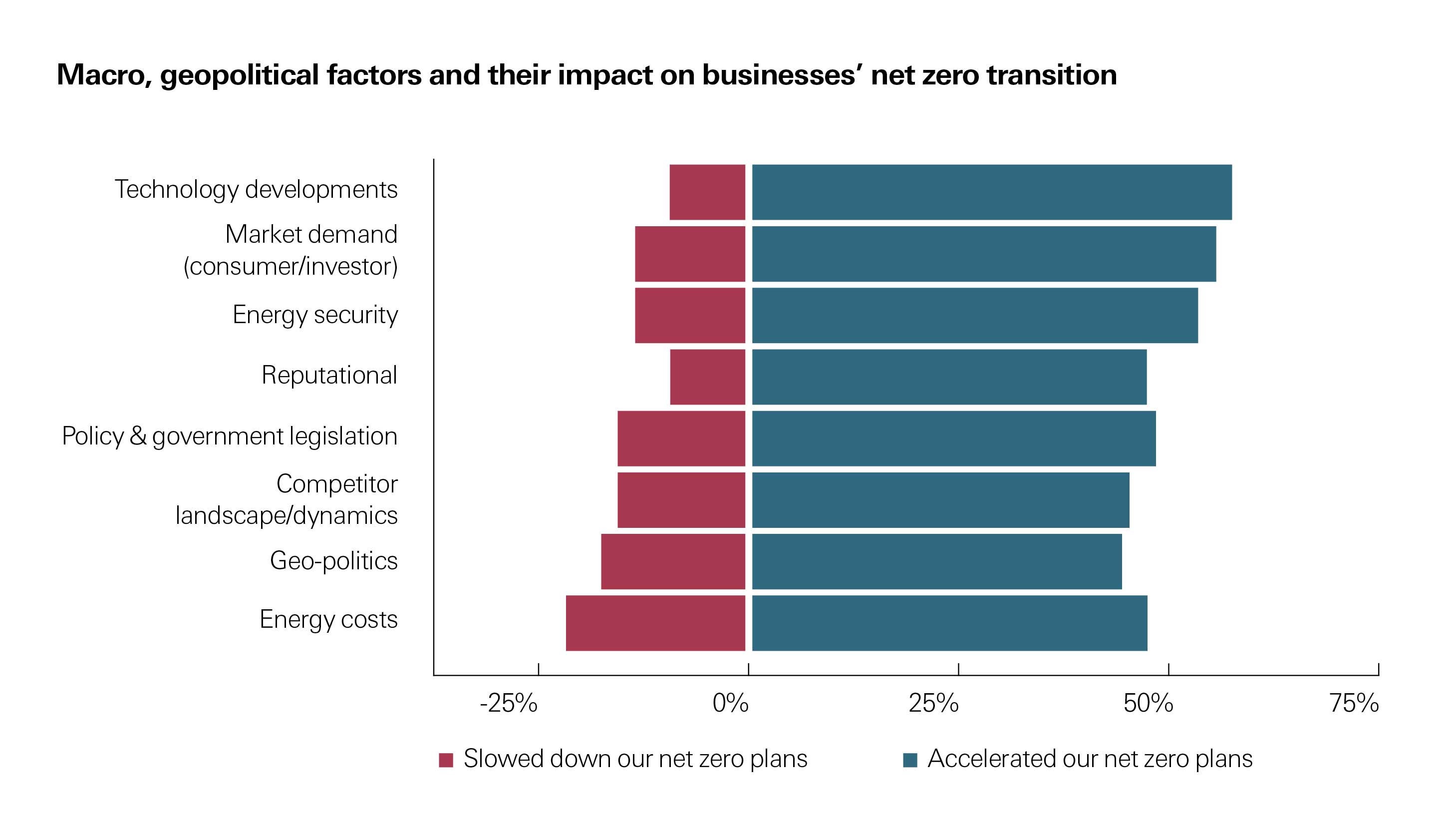 Even though recent events have put an acute focus on immediate energy security, a very high percentage of companies see macro events as a driving force for the transition and net zero as a commercial imperative. It’s clear there is an opportunity for this group of businesses to use the current elevated commodity prices and security agenda to invest in low-carbon initiatives that will become a significant source of future growth.